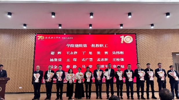 院长于方丽教授在致辞中回顾了学院十年不平凡的发展历程,向所有为学院建设付出心血的前辈、师生和各界朋友致以衷心感谢。大会特别设置了“致敬奉献”环节,学生代表向谢辉、曹静等14位建院第一批教师代表敬献鲜花,表达了深深的感恩与崇高的敬意。随后,大会对宋梦华、张金龙等16名十年来在教学、科研、管理服务一线做出突出贡献的在职教职工进行了隆重表彰,树立了爱岗敬业的榜样。建院元老曹静老师与学院首届本科毕业生、现已留校任教的杨超群老师,携手两位大一新生共同献词,象征着育人薪火代代相传,生动诠释了“立德树人”的根本使命。