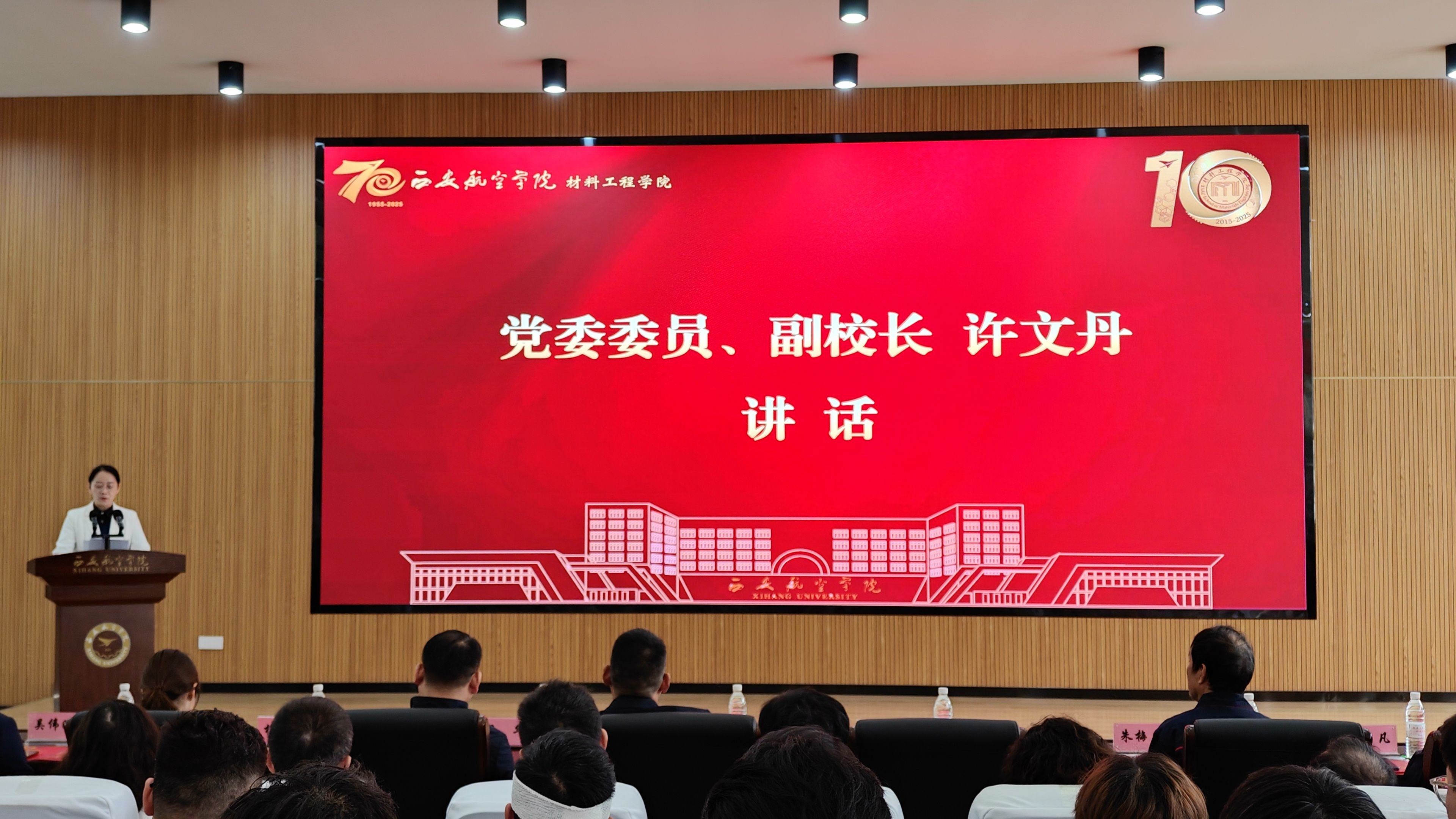 2025年10月14日上午,在喜迎西安航空学院70周年华诞之际,材料工程学院在阎良校区阶梯一报告厅隆重举行“十年聚力发展暨重点任务誓师大会”。副校长许文丹、合作企业代表、校友代表、曾在学院工作过的领导与教师,以及学院师生代表共计200余人齐聚一堂,共庆学院十载华诞,共绘未来发展蓝图。会议由党总支书记严碧峰主持。