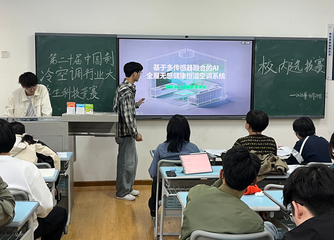 2026年4月24日下午,航空材料与新能源学院在阎良校区阎教1125教室举办了“第二十届中国制冷空调行业大学生科技竞赛校内选拔赛”,我院建筑环境与能源应用工程专业等16组团队共72名同学参加了本次竞赛,大赛设一等奖1个、二等奖2个、三等奖3个,优秀奖若干。本次大赛旨在锻炼同学们创新思维,为学生提供展示自己想法和创意的平台,并为全国制冷空调科技大赛选拔优秀人才。大赛邀请杜芳莉、路珍珍、李洁等老师担任评委。