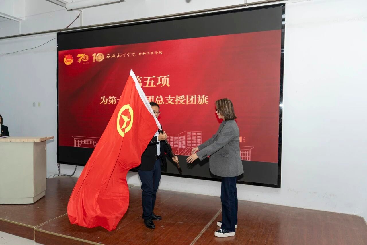 高均立副书记庄重地将承载着材料工程学院团总支责任与荣耀的团旗授予第十一届团总支书记胡欣雨老师。旗帜的传递,是组织的信任,是光荣的延续,更是沉甸甸的使命与担当。